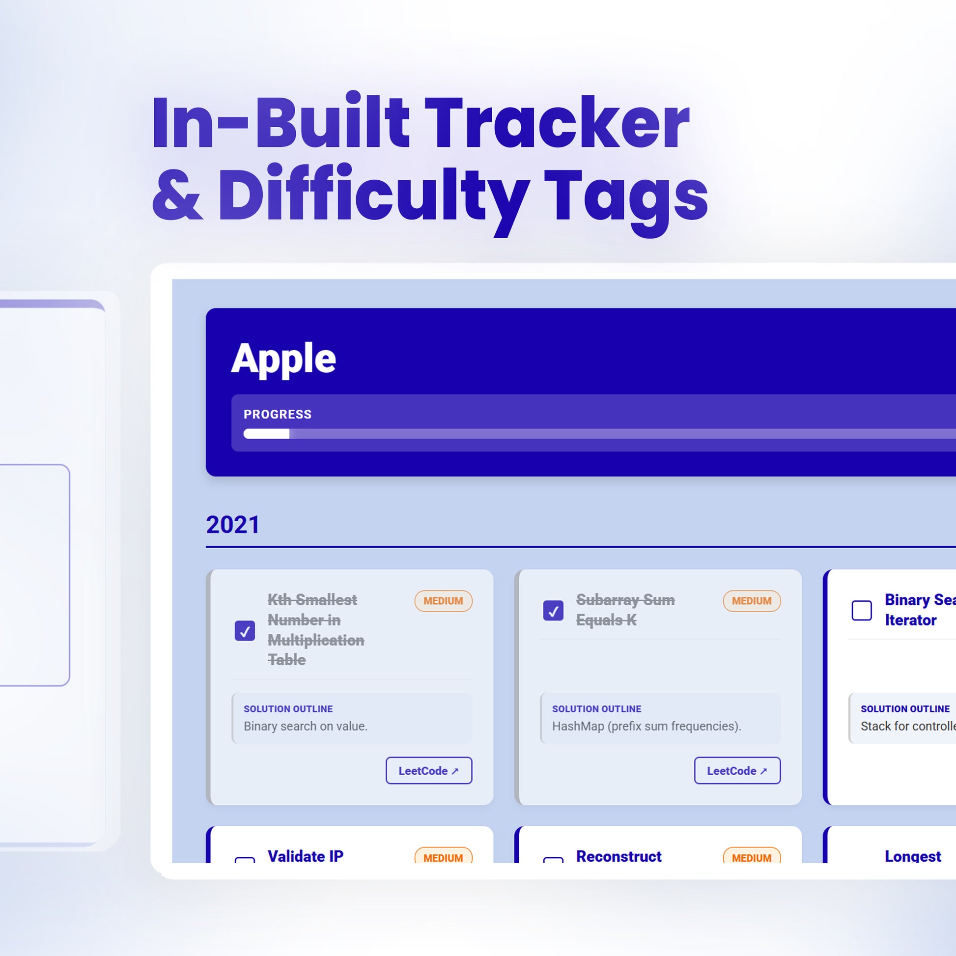 You get a complete preparation package: 300+ questions with company-wise segregation, difficulty tags (Easy/Medium/Hard), a built-in tracker to monitor your progress, and a structured preparation plan to guide your study schedule. Everything you need to stay organized and focused.